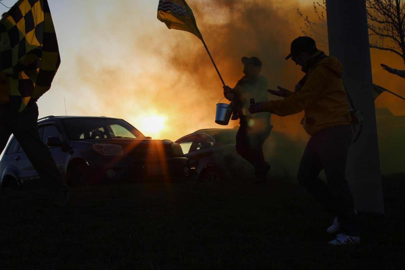 Local soccer fans march past a setting sun on the evening of ECFC's home opener in May 2022. (Photo: Dan Morrison) |
